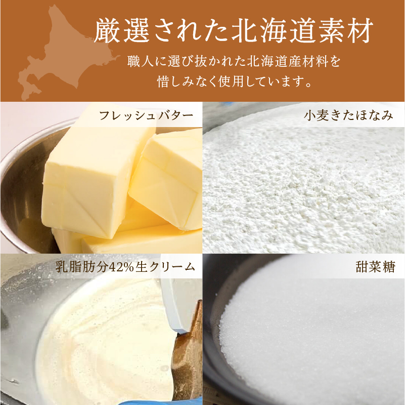原材料名:卵(北海道産)、砂糖、クリーム、植物油脂、バター、小麦粉、アーモンドパウダー、粉糖、水飴、米粉、ごま油、洋酒、コーンスターチ / 加工デンプン、トレハロース、乳化剤、膨張剤、香料、(一部に大豆・卵・乳成分・小麦・アーモンド・ごまを含む)