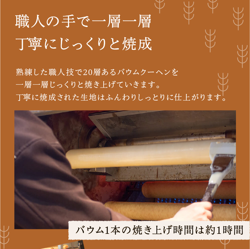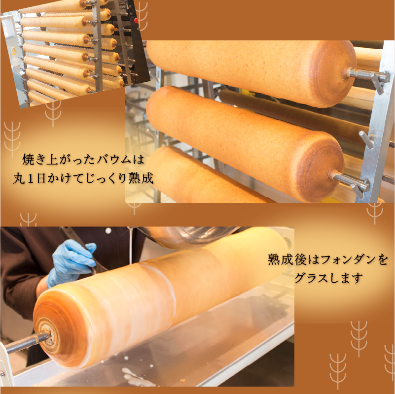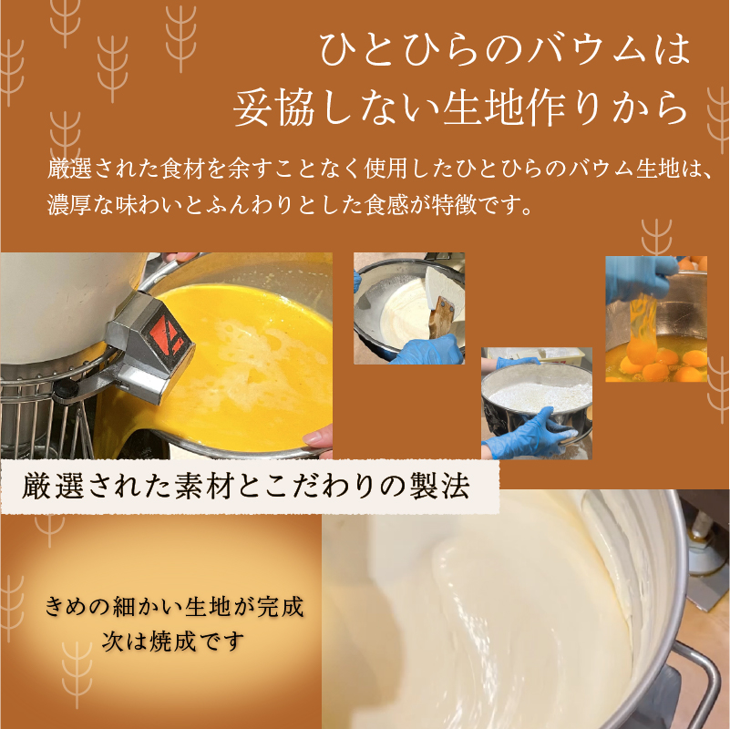 北海道産のこだわりの原材料のみを使っています。 生地の製法、焼成方法など職人による徹底した温度管理により、しっとりと濃厚でふんわりとした卵のコクを感じるバウムクーヘンに仕上げております。